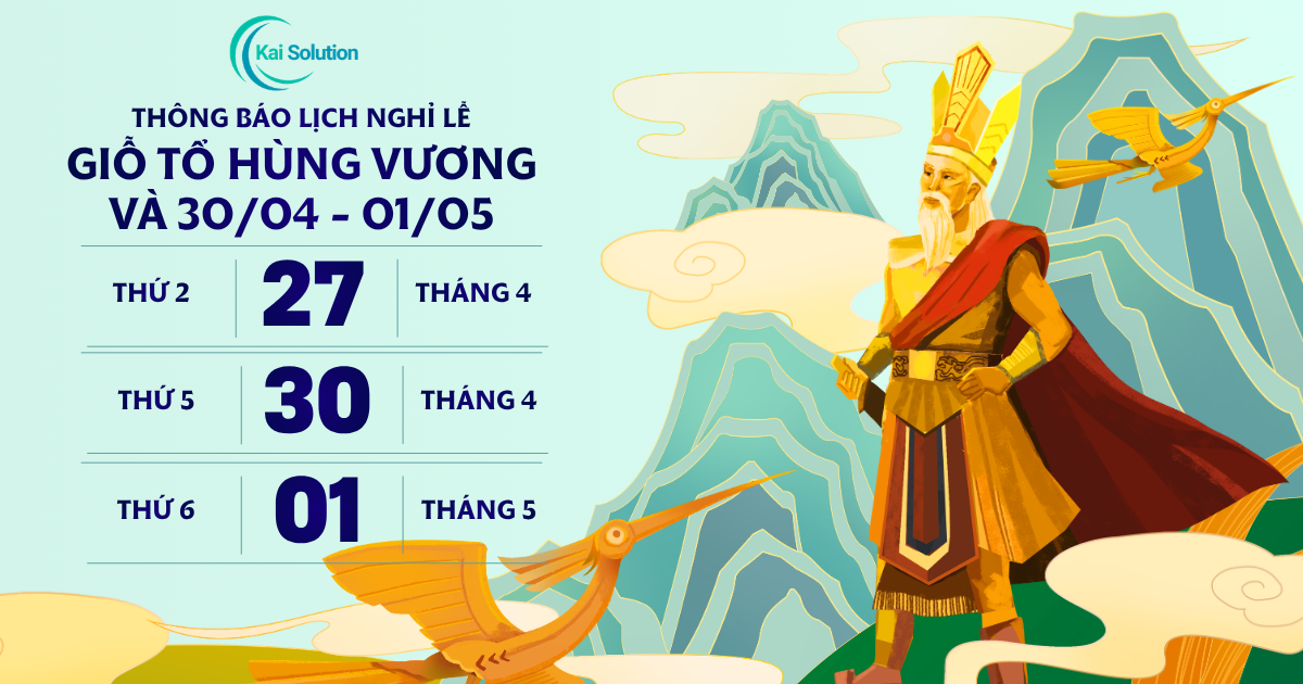Theo quy định của Nhà nước về việc nghỉ các ngày Lễ trong năm 2026, KaiSolution trân trọng thông báo lịch nghỉ lễ Gỗ tổ Hùng Vương, Giải phóng Miền Nam 30/4 và Quốc tế Lao động 1/5 như sau:
