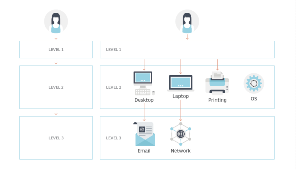 IT Helpdesk/IT Support thường là điểm liên hệ đầu tiên của nhân viên và khách hàng để nhận trợ giúp về các vấn đề CNTT. Họ có thể gửi yêu cầu về vấn đề của mình và một thành viên nhóm CNTT sẽ giúp họ giải quyết vấn đề đó. Hoặc họ có thể tìm kiếm thông qua cơ sở kiến thức (knowledge base) có nội dung trợ giúp để tự tìm câu trả lời.